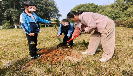 考虑到孩子们的协调能力和专注力,活动流程被精心拆解为“挖坑、扶苗、培土、浇水”四个简单步骤。老师们采用了“一对一”或“二对一”的陪同模式,手把手地帮助孩子完成每一个动作。在老师和工作人员的辅助下,两名儿童在老师的陪伴下,小心翼翼地扶住小树苗,虽然他们站得都不太稳,但当看到泥土被翻起并盖上树根,小树苗被种好的那一刻,孩子的脸上露出了纯真的笑容。